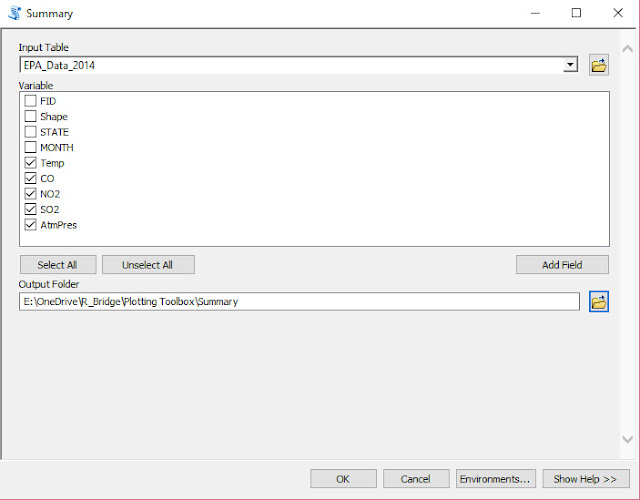 Here the user has to point to the dataset s/he wants to analyze in "Input Table". This can be a shapefile, either loaded already in ArcGIS or not, but it can also be a table, for example a CSV. That is the reason why I included a CSV version of the EPA dataset as well.